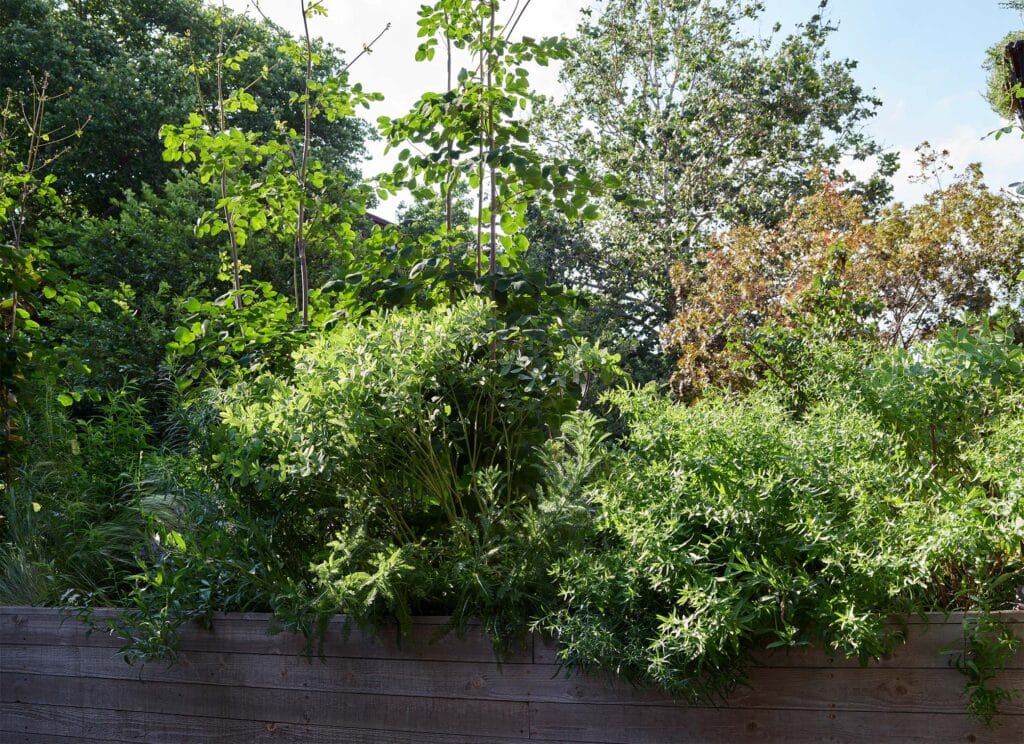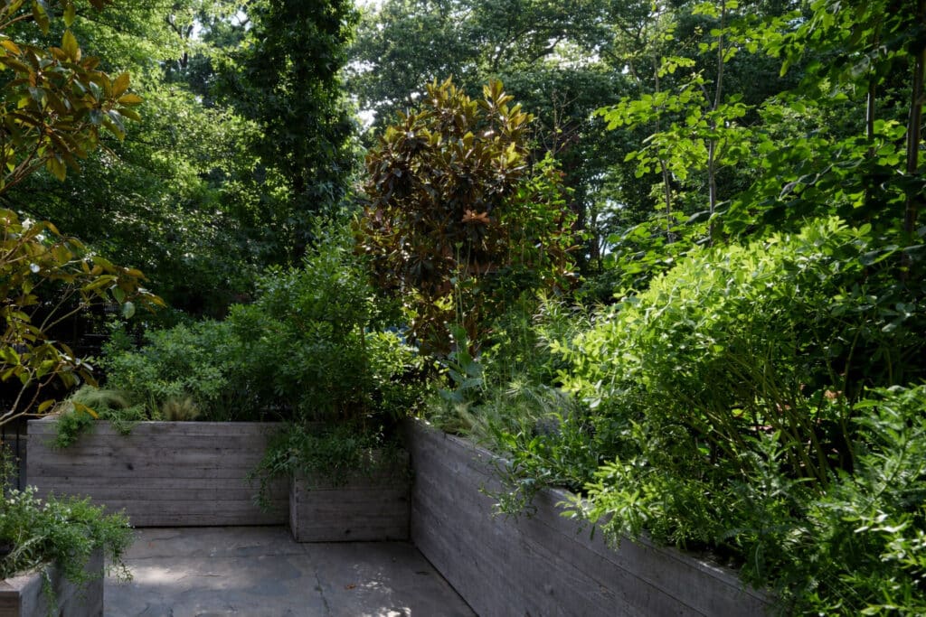 Dense planting, elevated planters, and framed seating areas create a sense of enclosure and retreat, while allowing the spaces to open for hosting and circulation.